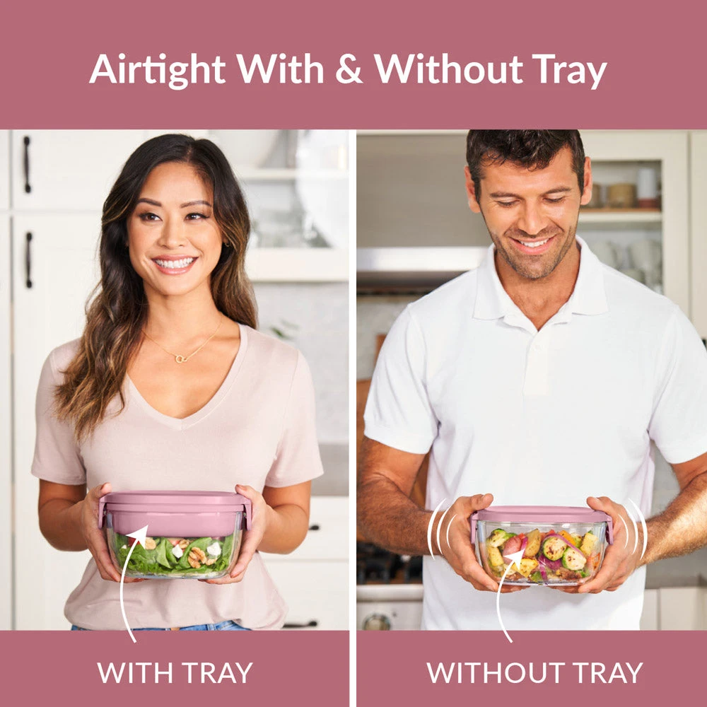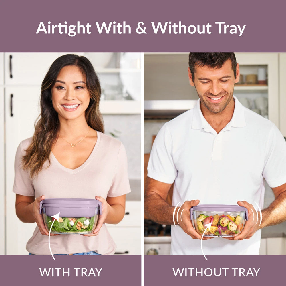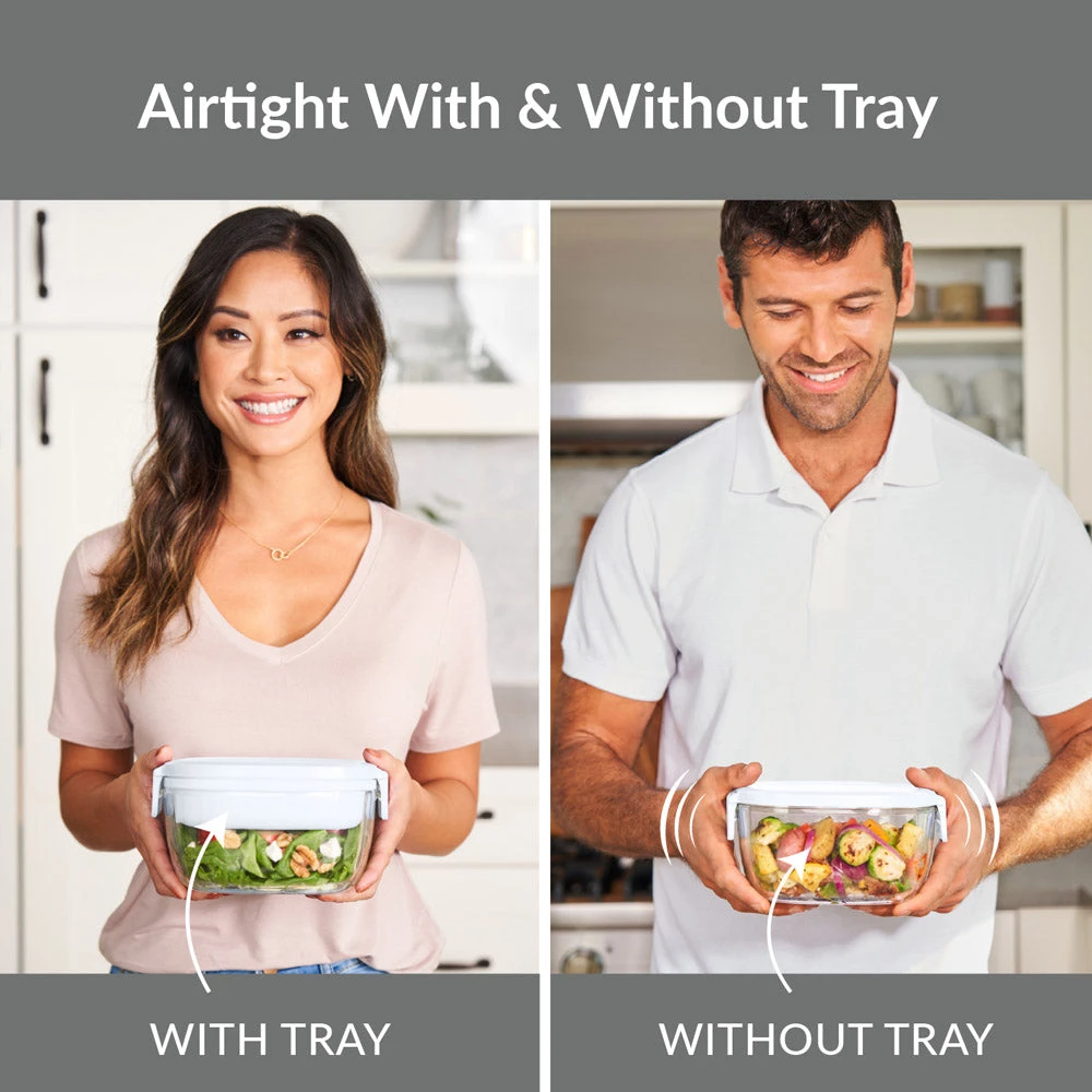 - LARGE, AIRTIGHT SALAD BOWL: Keep food fresh longer with this spacious 7.6 cup glass bowl to mix your salad ingredients. The unique silicone seal around the lid and locking clips prevent leaking when you use it without the tray.