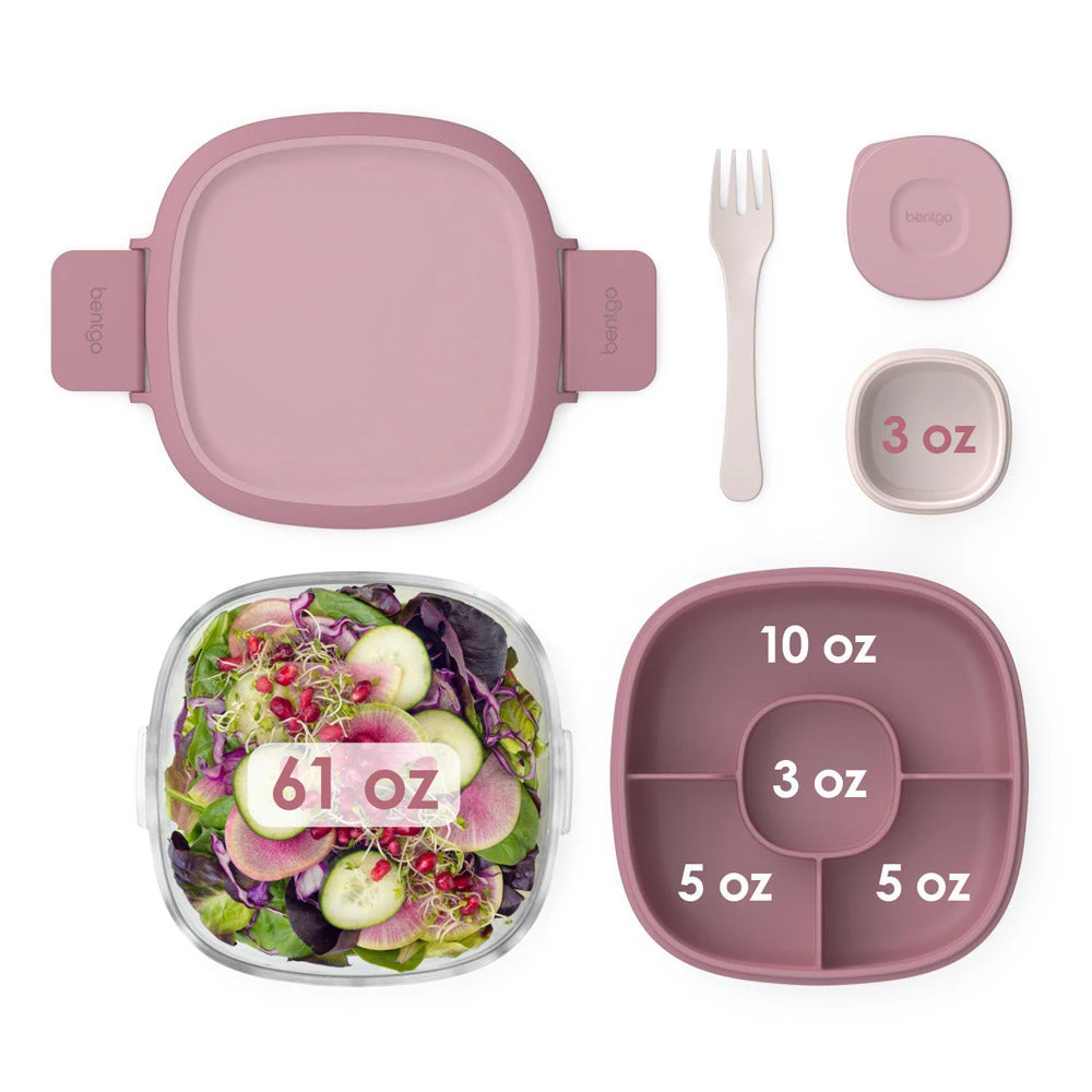 Bentgo® Glass Salad Container makes it easy and convenient to eat healthy salads on the go. The all-in-one design offers the perfect solution for mess-free transport of your greens, salad toppings, and salad dressing so you can enjoy a delicious and nutritious salad just about anywhere. Ideal for pre-prepped meals to take to the office, school, or an outdoor picnic. Let your imagination run wild when you shake this spacious 7.6 cup glass bowl to mix your salad ingredients. The unique silicone seal around the lid and locking clips prevent leaking when you use it without the tray. Easily hold a hearty helping of greens, pasta, or fruit making it the perfect size for even the hungriest appetites All the components of Bentgo Glass stack conveniently inside the large salad bowl for easy portability while a reusable fork stores under the lid for a complete all-in-one meal solution and helps cut down on the need for single-use plastics.