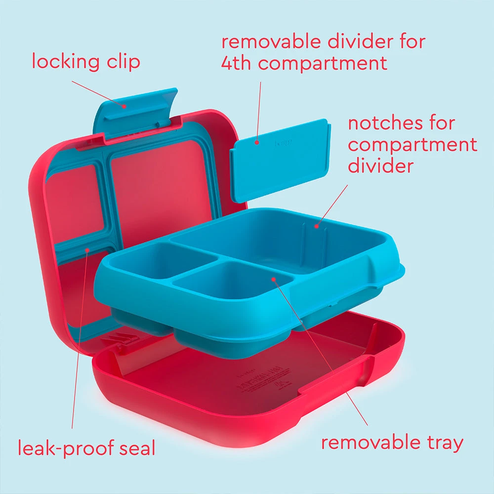 The Bentgo® Pop Lunch Box livens up the lunchtime routine with its bright, bold colors and stylish design. Perfect for big kids and teens, this sleek lunch box holds up to 5 cups of food and features a removable tray with 3 compartments for one entree and two sides. Insert the optional divider to create 4 compartments when you want to pack even more variety. It’s stylish, colorful, and leak-proof; so you never have to worry about spills in your backpack or bag.
