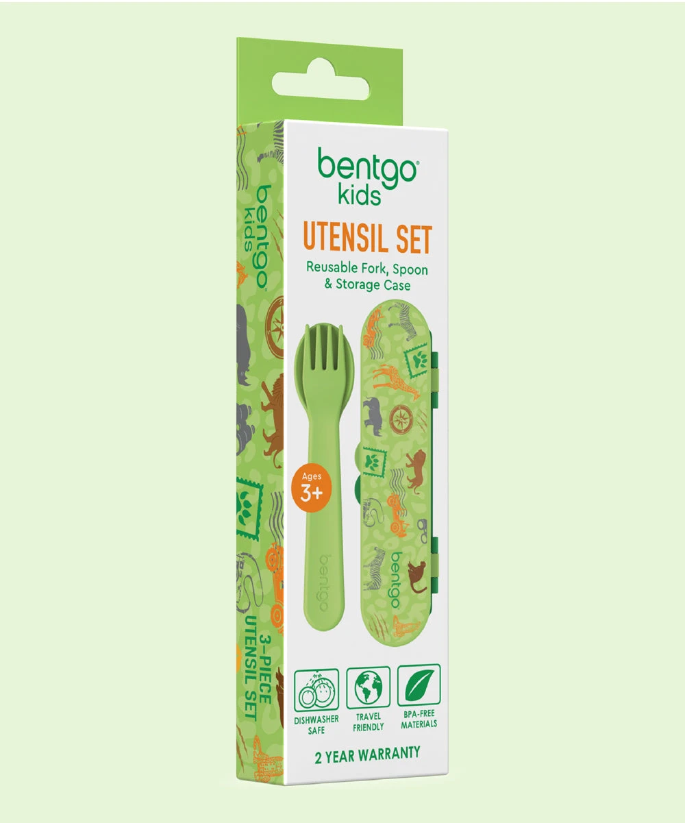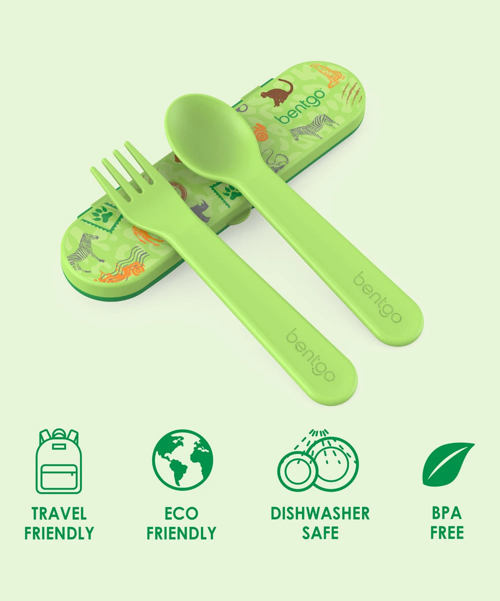 These matching utensils feature a colorful storage case for mess-free carrying.
